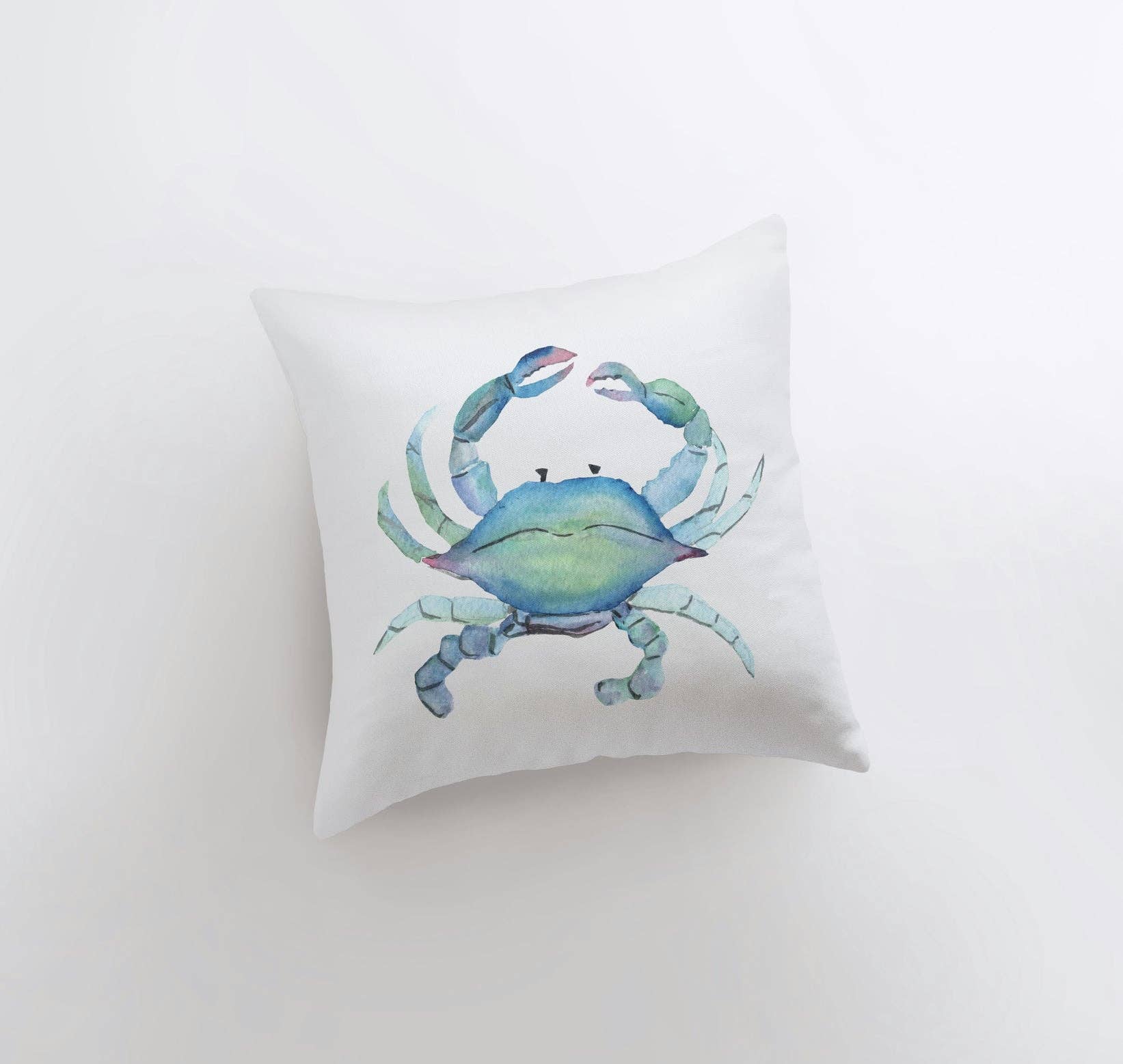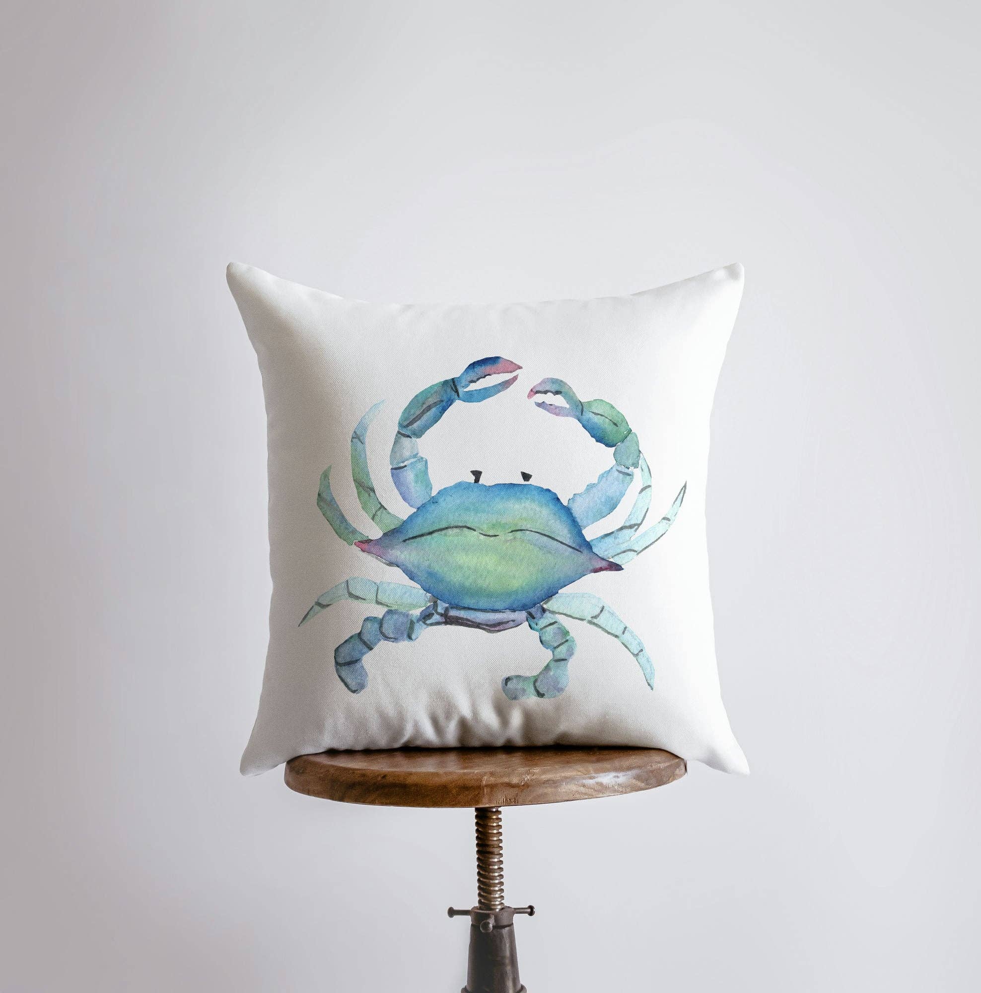 Bring a breath of cool coastal air to your home with this blue-hued watercolor crab pillow. The front features a detailed watercolor crab design, while the back is finished with soft, ocean-toned stripes that echo the rhythm of the sea. A refreshing accent for any beach house, cottage, or ocean-inspired space.