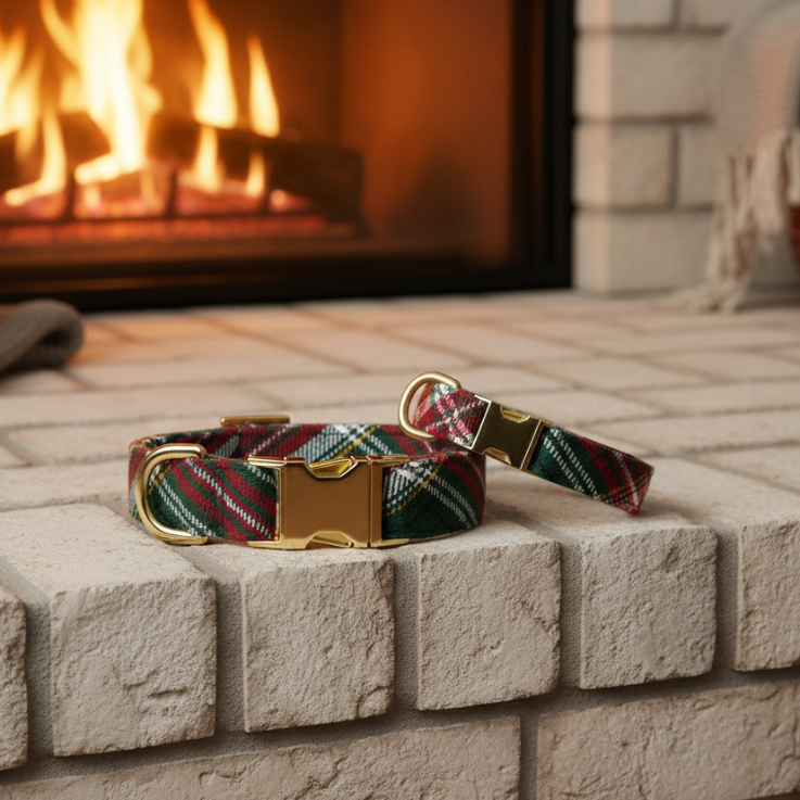 Festive, timeless, and built to last—our Holly Jolly Flannel Collar brings seasonal charm to your dog’s everyday adventures. With a classic green-and-red plaid pattern and luxe gold hardware, it’s the perfect accessory for family photos, holiday gatherings, and cozy winter walks.